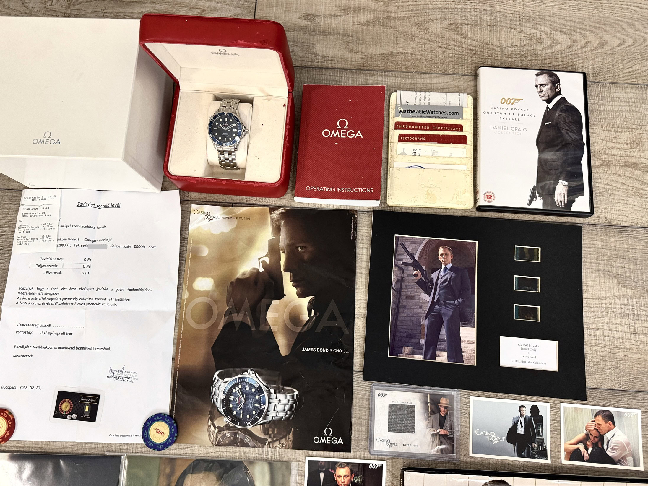 • Hivatalos Casino Royale DVD – Daniel Craig Collection• Omega “James Bond’s Choice” promóciós magazin oldal• Casino Royale bekeretezett 35 mm-es filmkocka display, Daniel Craig jelenettel és eredetiségi tanúsítvánnyal