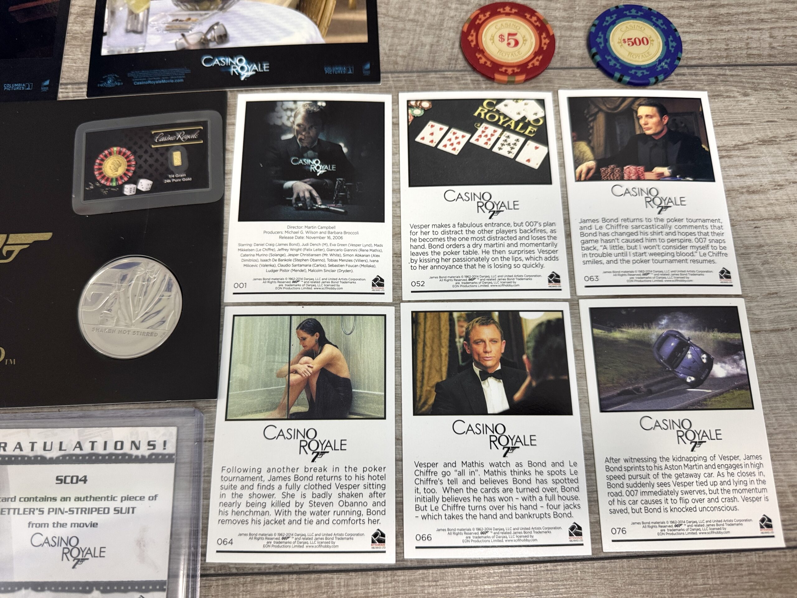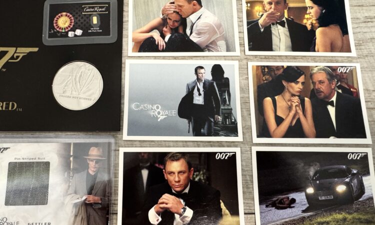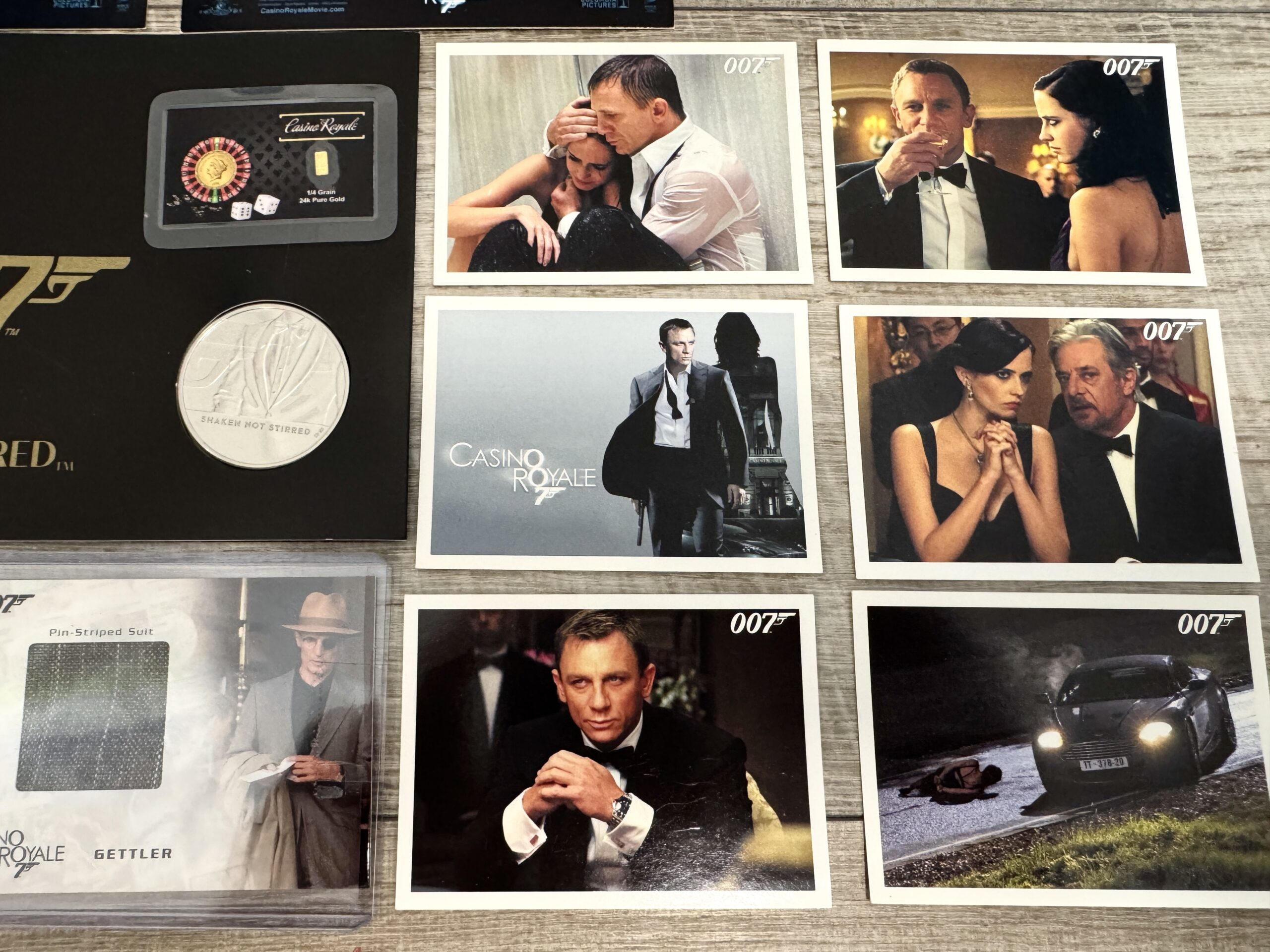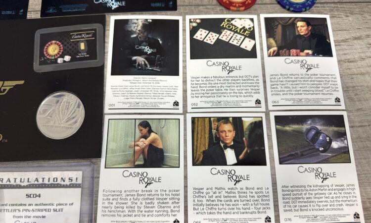 • James Bond filmben használt jelmez relikvia kártya – eredeti szövetdarab Gettler csíkos öltönyéből a Casino Royale filmből• Casino Royale ezüst gyűjtői érme – “Shaken Not Stirred” kiadás• Casino Royale 24 karátos mini aranyrúd (1/4 grain)