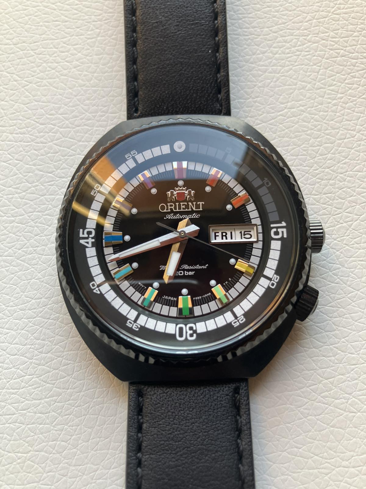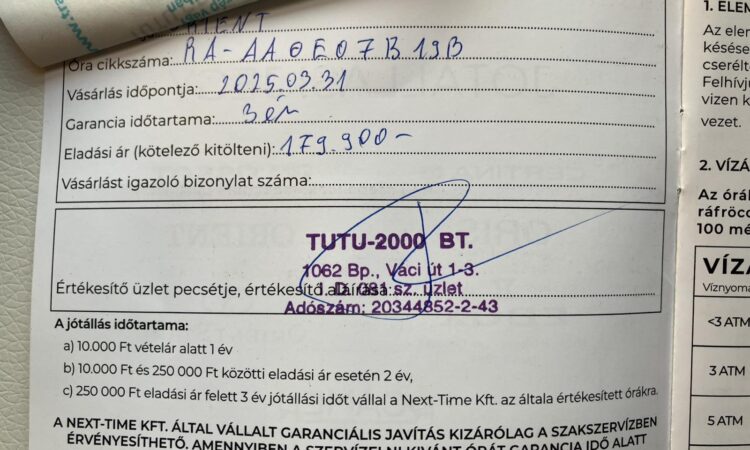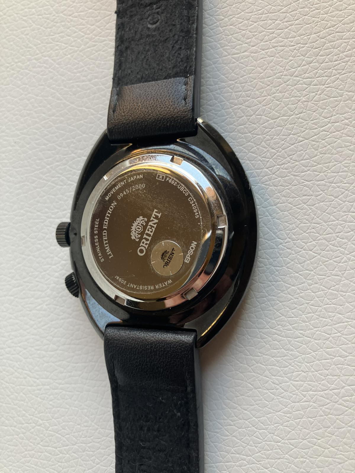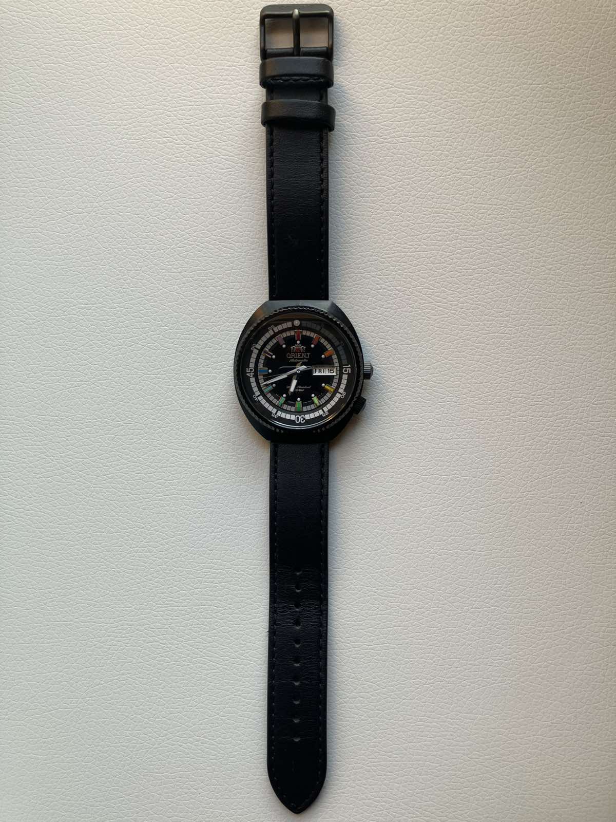 Eladó a képeken látható Orient automata karóra. 2025-03.31.-i vásárlás 3 év garanciával. Pár alkalommal viselt, karcmentes, a hátlapon még fenn van a védőfólia. 2000db-ra limitált, nr0945/2000. Díszdobozzal és papírokkal, ajándék nato szíjjal. Vízállóság: 200m, tok átmérő: 44mm, tok anyag: nemesacél, fekete PVD bevonattal. Szíj: 20mm széles fekete bőrszíj + ajándék nato szíj. Koronával állítható belső lünetta.