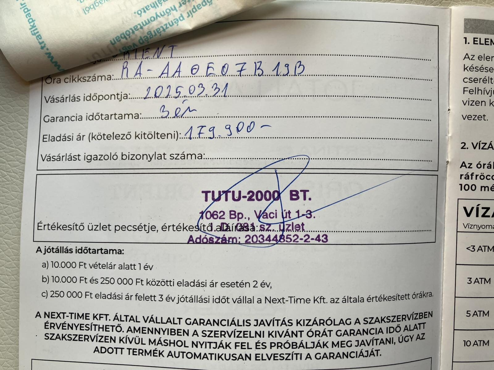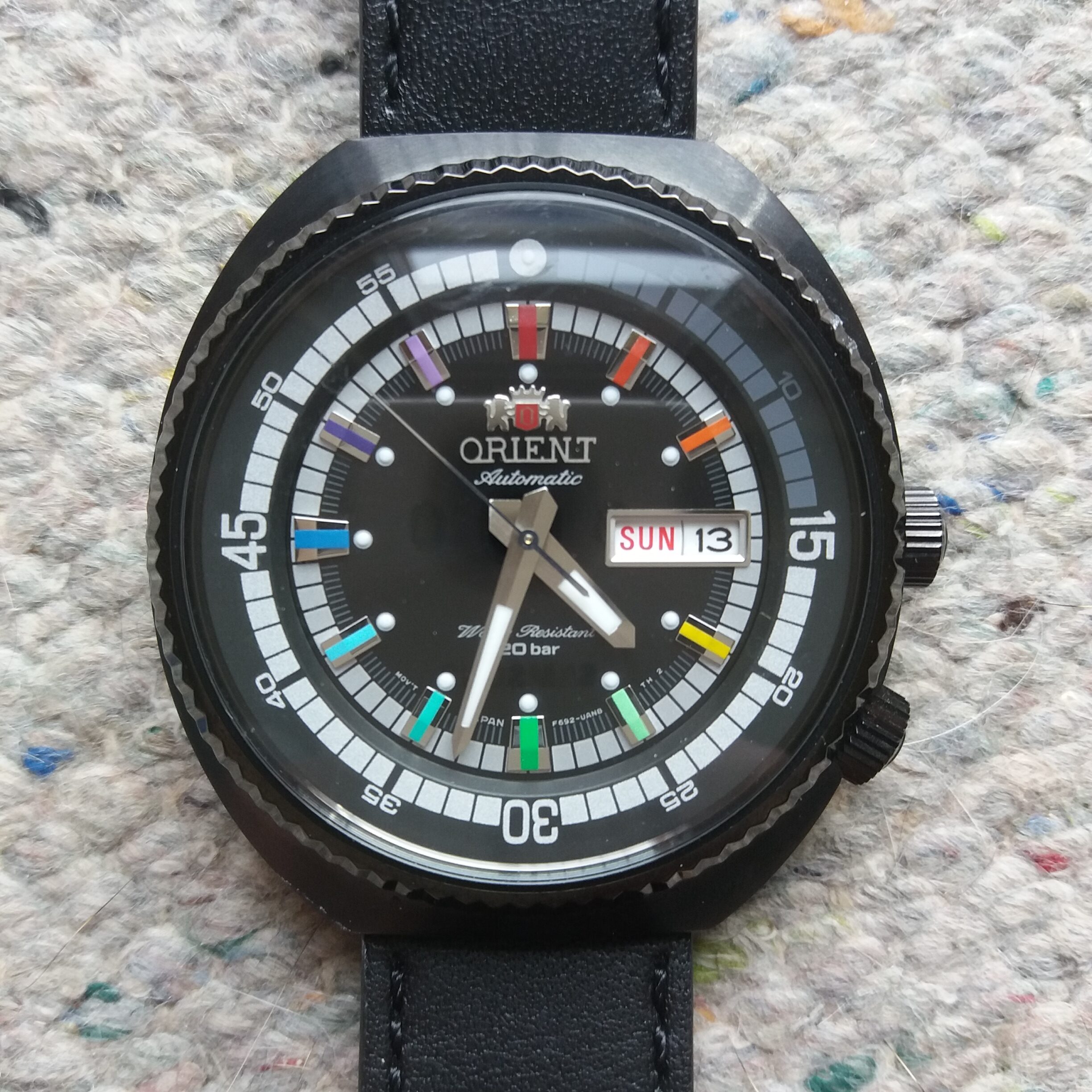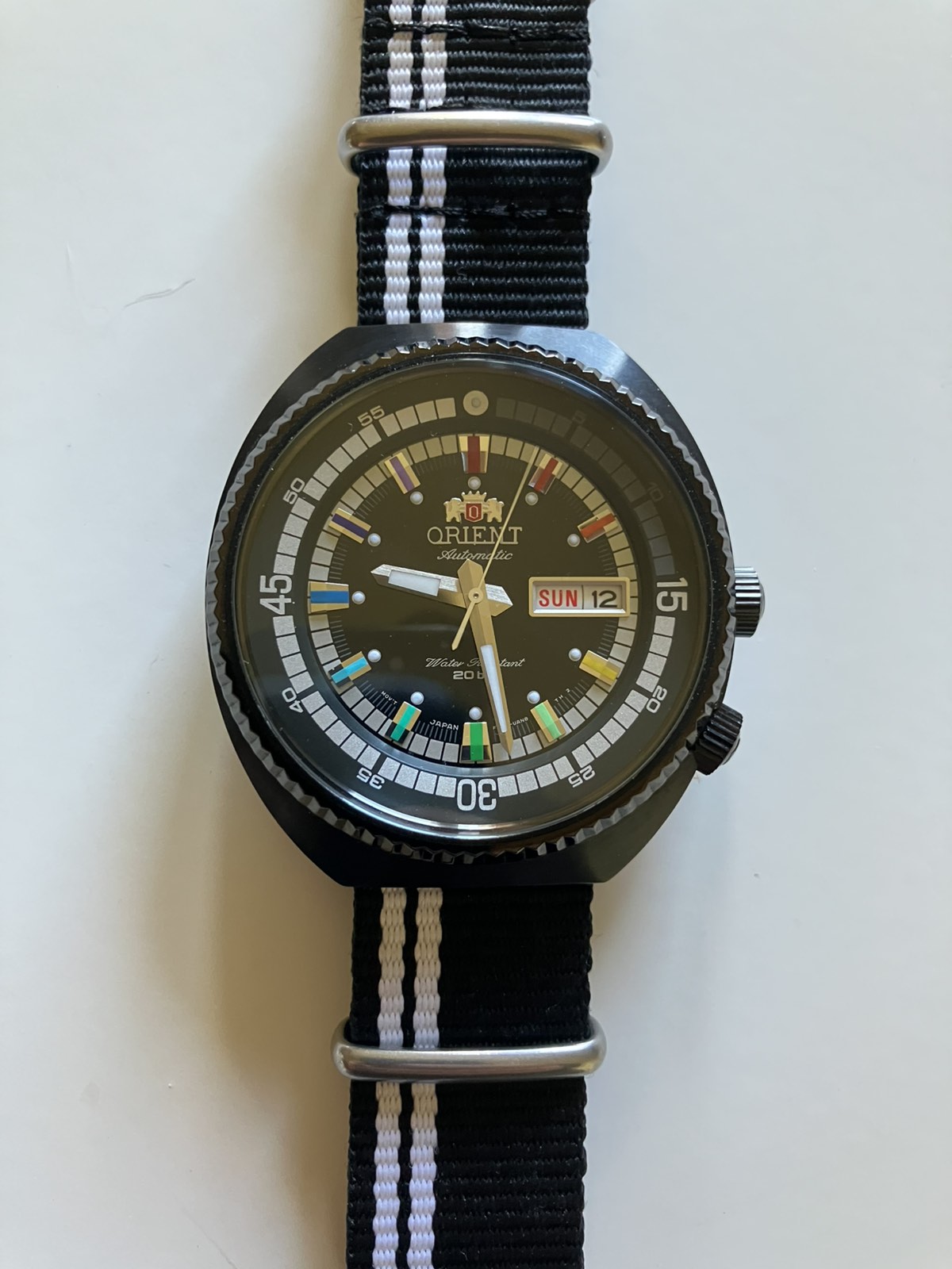 Eladó a képeken látható Orient automata karóra. 2025-03.31.-i vásárlás 3 év garanciával. Pár alkalommal viselt, karcmentes, a hátlapon még fenn van a védőfólia. 2000db-ra limitált, nr0945/2000. Díszdobozzal és papírokkal, ajándék nato szíjjal. Vízállóság: 200m, tok átmérő: 44mm, tok anyag: nemesacél, fekete PVD bevonattal. Szíj: 20mm széles fekete bőrszíj + ajándék nato szíj. Koronával állítható belső lünetta.