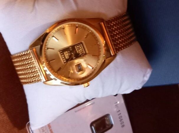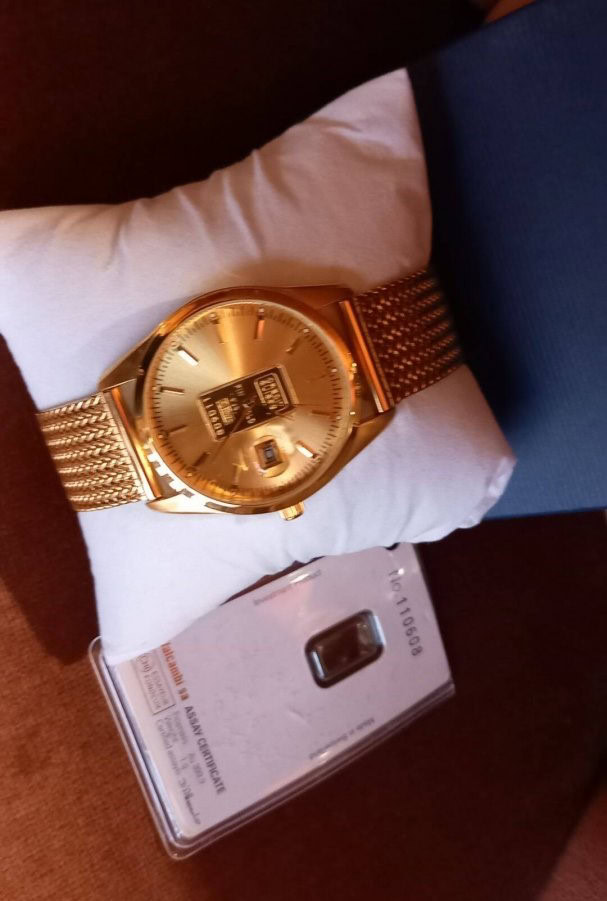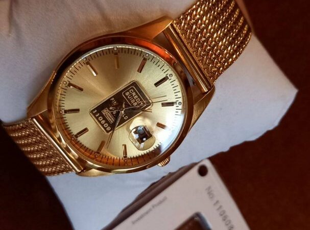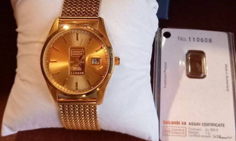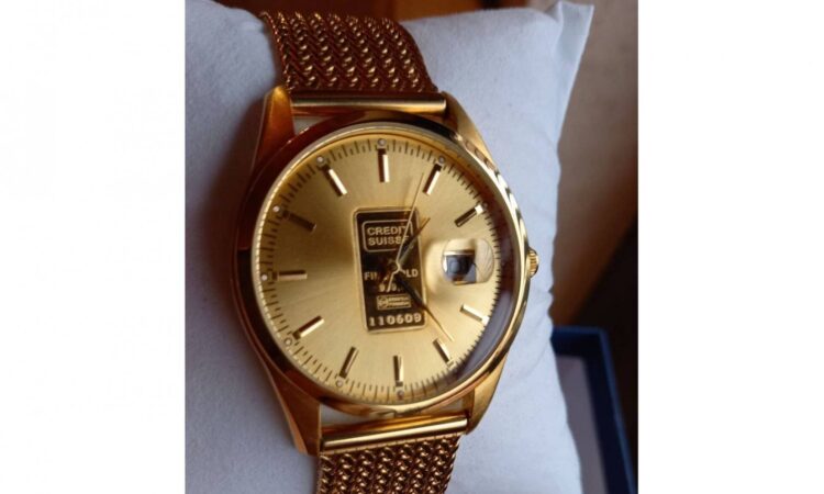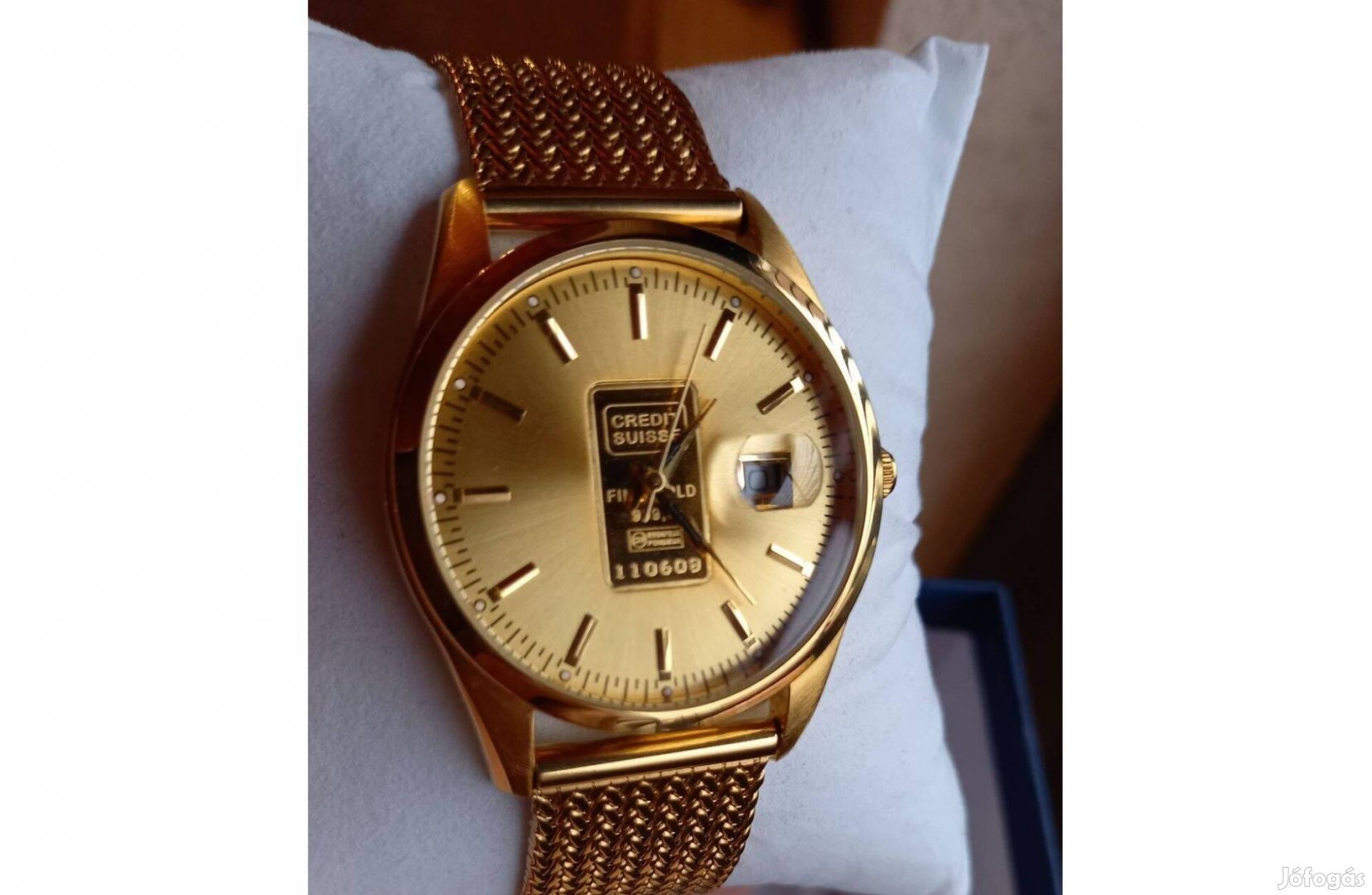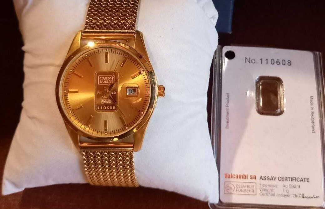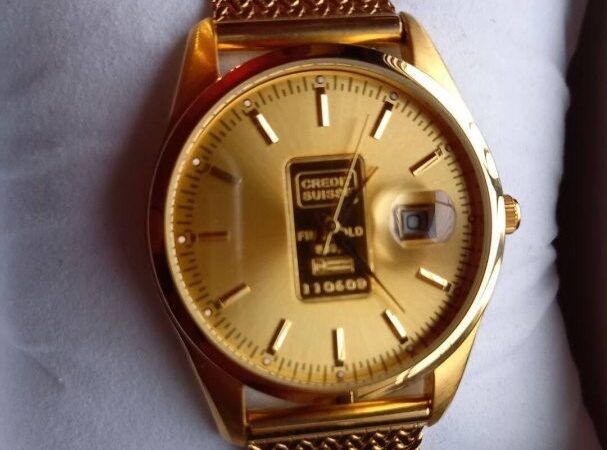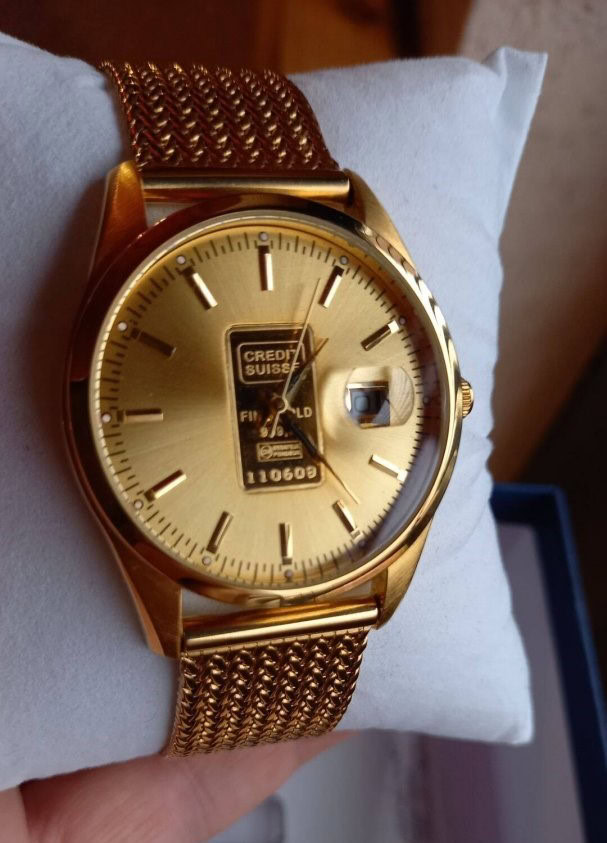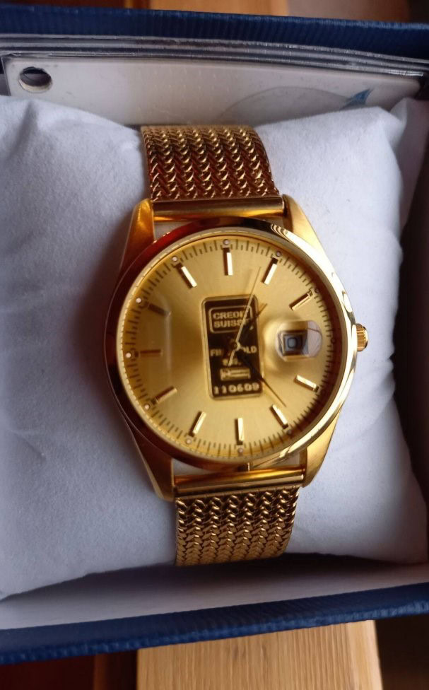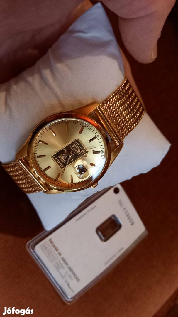 Arannyal van bevonva az óra, a tárcsa közepén lévő Credit Suisse tábla pedig Au 999.9 %-os tisztaságú 1 gramm színarany + egyedileg sorszámozott is.Megbízható és különösen elegáns. Gyönyörű termék saját használatra, befektetésnek vagy ajándékba. Ez az óra újnak tekinthető, nem volt használva, páncélszekrényben állt.Méretek: kb. 40 mm átmérő, 14 mm vastagság. Óra működés: precíziós quartz szerkezet, másodperc mutatóval és arany óráknál ritka dátum kijelzéssel.Vízállókb. 50 m-ig. Üveglap: ásvány kristály. Ajándéknak is ideális. Ragyogás és exkluzivitás igényesnek, megfizethető áron, rendkívül elegáns design-al.