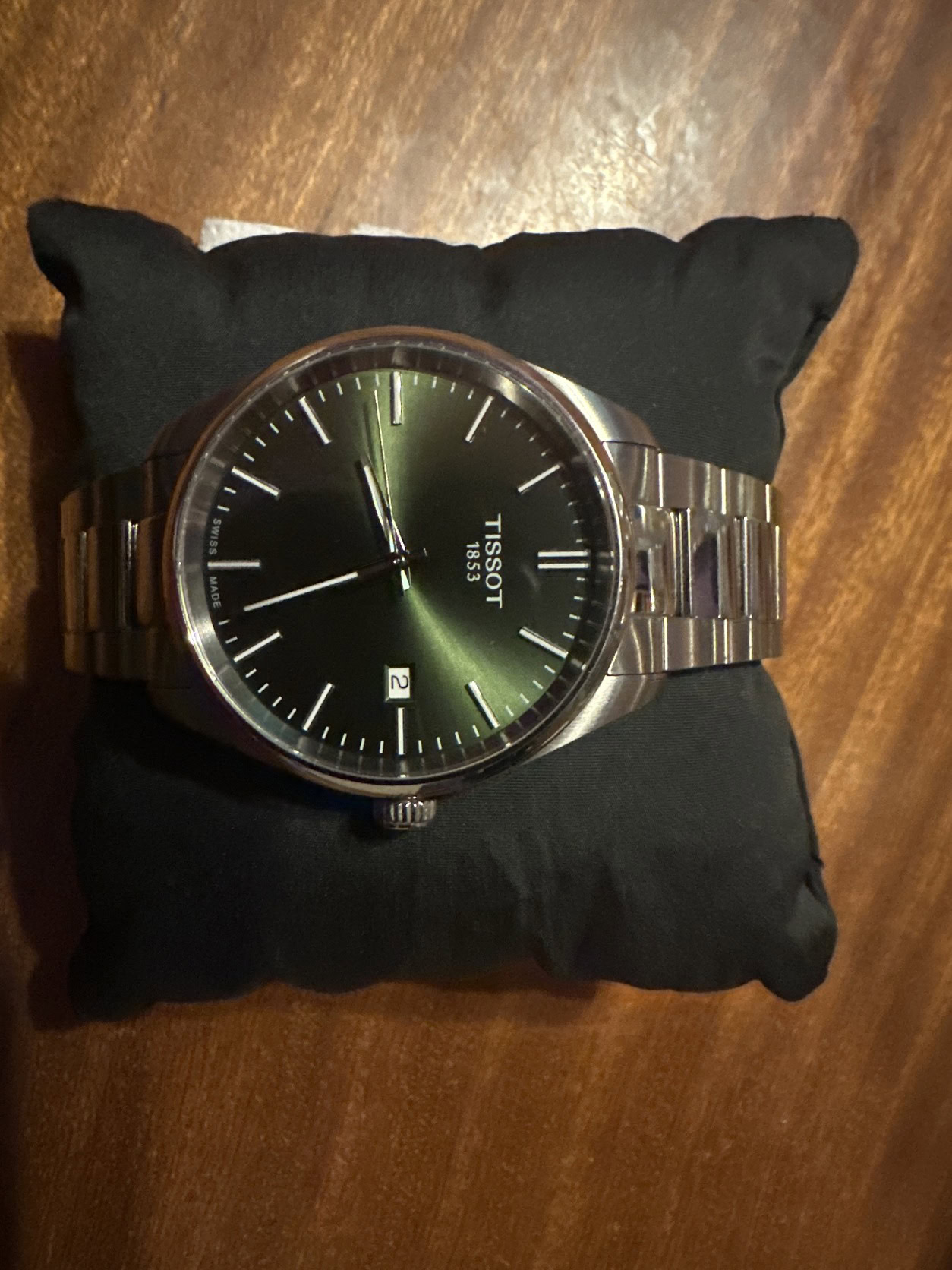 Eladó egy eredeti Tissot PR 100 Quartz férfi karóra (ref. T150.410.11.091.00), elegáns zöld sunburst számlappal és rozsdamentes acél szíjjal.A modell a Tissot T-Classic kollekció tagja, időtálló, letisztult formavilággal.