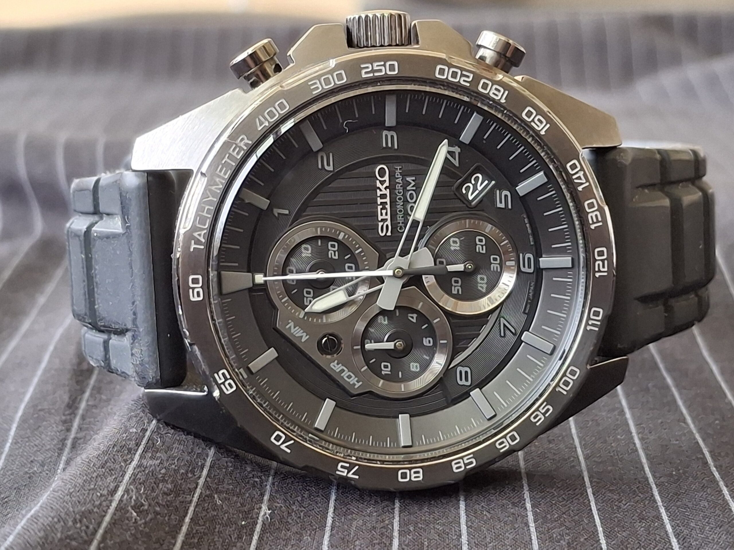 A gyári és igen kényelmes sziliokon szíj, a tok, a különleges és bordázott mintázatú számlap mind-mind feketék, melyeket feldobnak a szürke indexek, számok és a fehér mutatók. Komoly, határozottságot sugalló darab, mely rendkívül különleges, megjelenését a fotók közel sem adják vissza. A színei okán mind az elegáns, mind a sportos/vagány felhasználást lehetővé teszi. A számlapja nehezen fotózható, ezért teszek fel egy netes képet is, a többi mind az eladó óráról készült, de a különböző fények hatására más-más arcát mutatja meg a ketyegő. Az óra minőségéhez sokat nem is kell tenni, annyi talán elég, hogy Seiko és Japán, állapota nagyon szép, de ez a fotókon, minden porcikáján látható, hiszen nagyon megvigyázott darab, ideje nagyrészét a dobozában töltötte. Már nem kapható, így a makulátlan állapota mellett a kedvező ára is csábító. (A képeken az üveg és a szíj csak szöszös). Állapot a képek szerinti, azok a valóságot tükrözik.